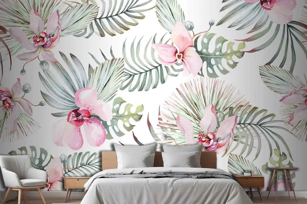 Tropikal Bitki Orkidesi Ve Çiçeklerinin Kusursuz Deseni Yatak Odası Duvar Kağıdı