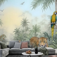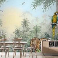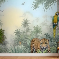 Tropikal Ormanda Leopar Ve Renkli Papağan Duvar Kağıdı