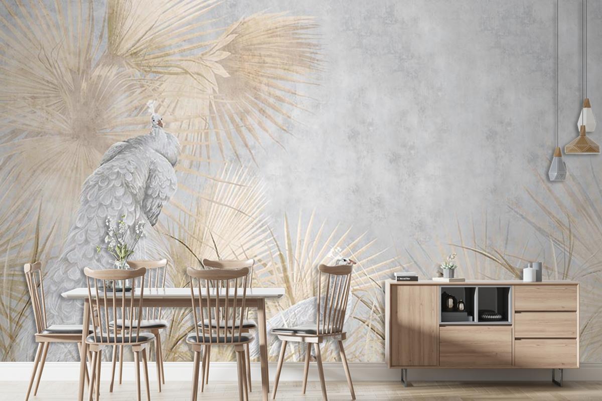 Tropikal Yapraklar Ve Tavus Kuşları Duvar Kağıdı