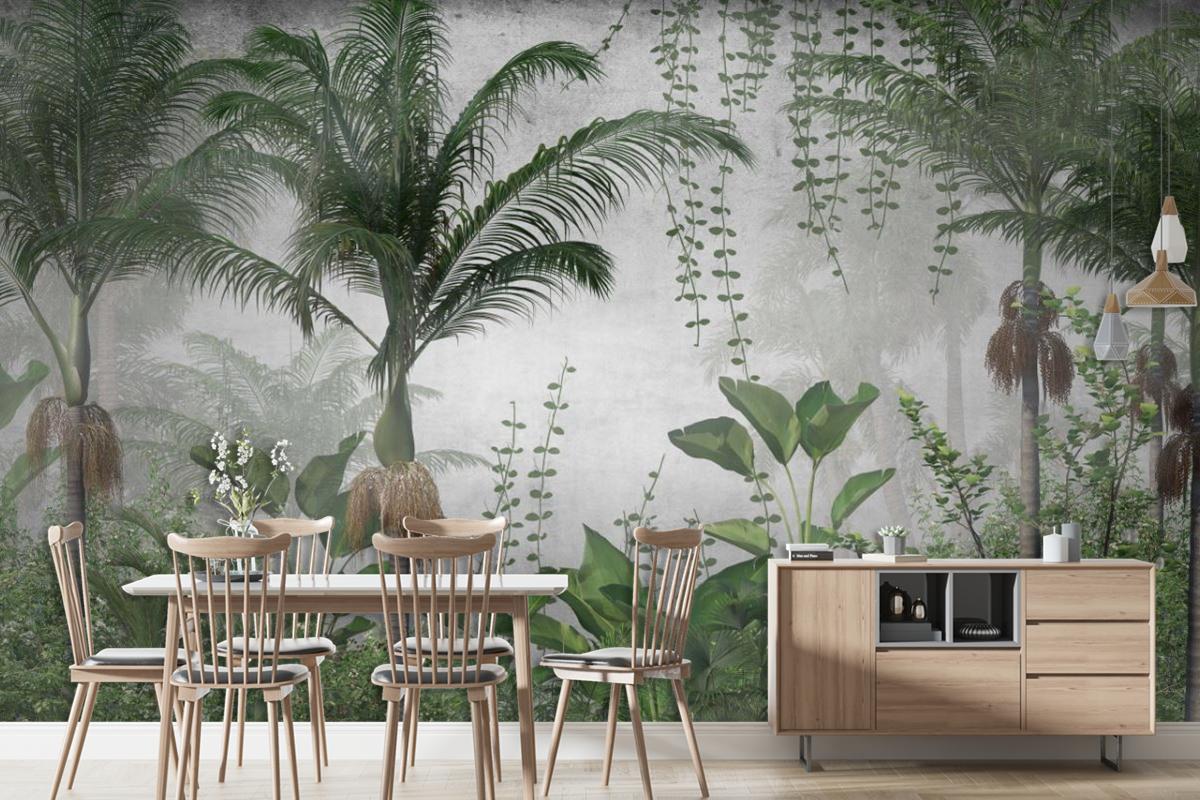 Tropikal Yapraklı 3D Görünümlü Pembe Flamingo Duvar Kağıdı