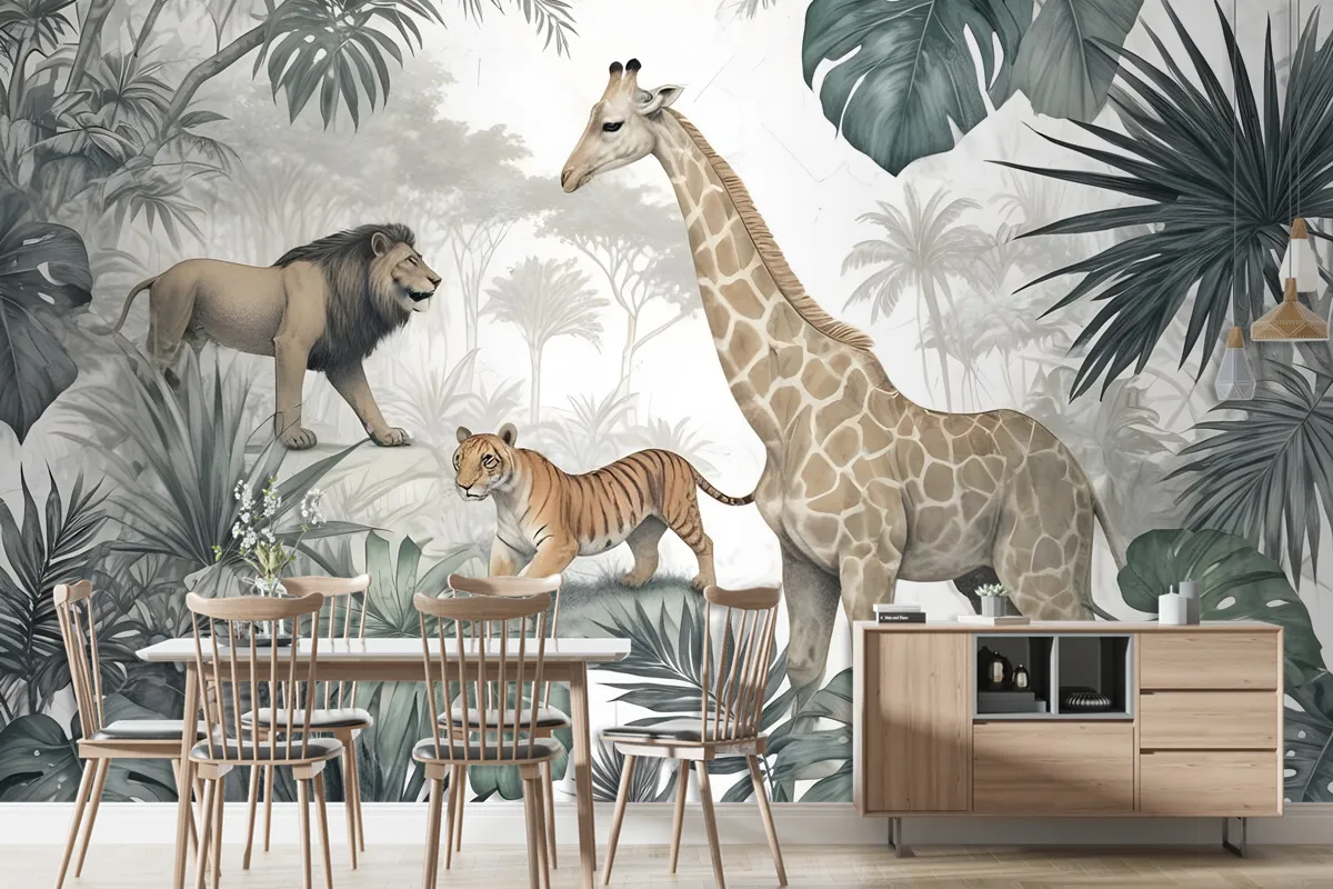 Tropikal Yapraklı Retro Vahşi Hayvanlar Duvar Kağıdı