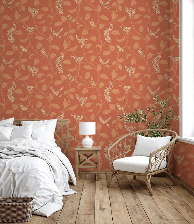 Turuncu Dallı Çiçekli Kuşlu Duvar Kağıdı 53081