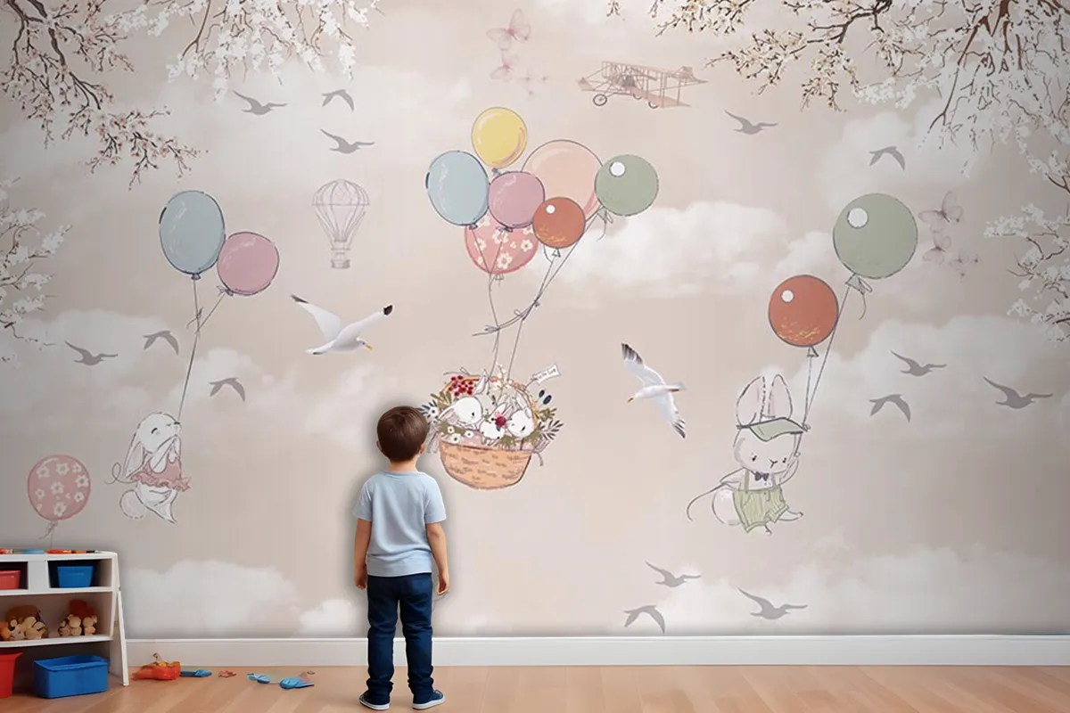 Uçan Balonlar Ve Sevimli Tavşanlar Çocuk Odası Duvar Kağıdı