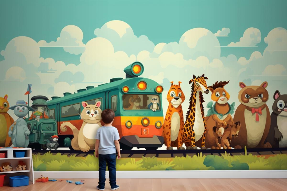 Üstünde Hayvanların Olduğu Bir Tren Ve Önünde Zürafalar Yazan Bir Tren Çocuk Odası Duvar Kağıdı