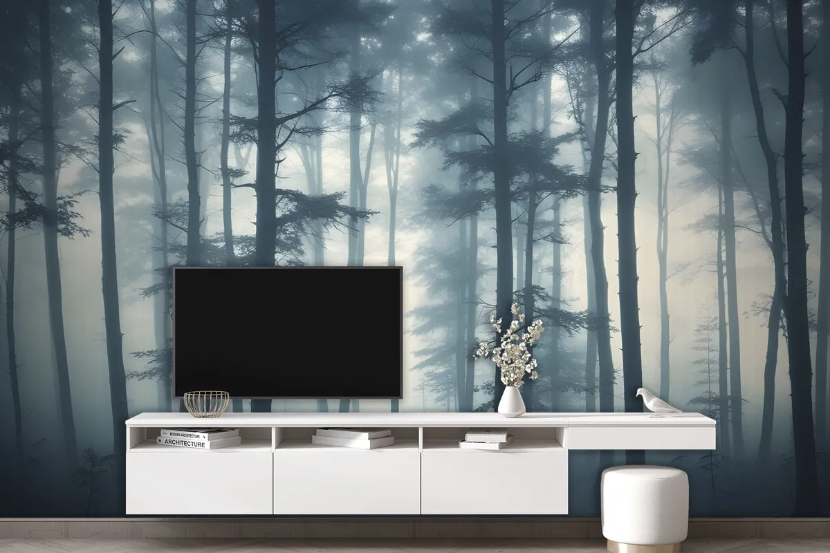 Uzun İnce Ağaçlar Ve Sisli Bir Atmosferle Yoğun Puslu Orman Oturma Odası Salon Duvar Kağıdı