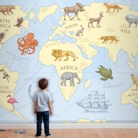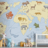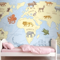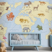 Vahşi Hayvanlarla Vintage Dünya Haritası Çocuk Odası Duvar Kağıdı