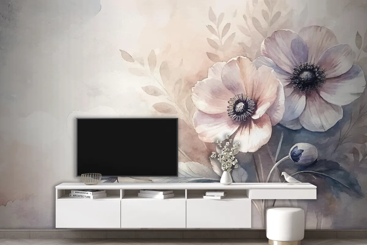 Vintage Anemon Çiçek Suluboya Arka Plan Oturma Odası Duvar Kağıdı