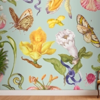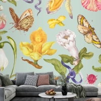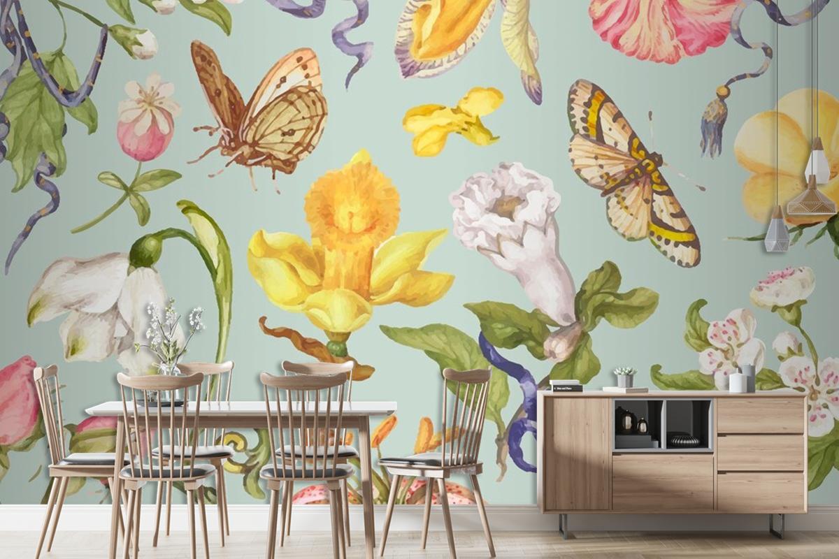 Yeşil Arka Planda Renkli Vintage Çiçek Deseni Duvar Kağıdı