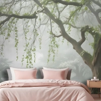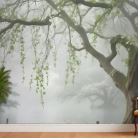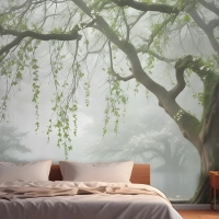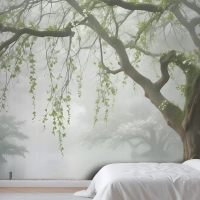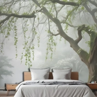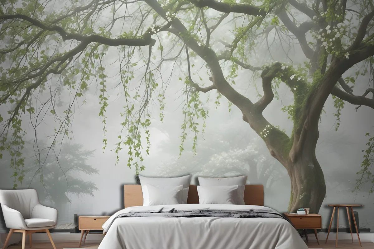 Yeşil Beyaz Yapraklar Ve Çiçekler Ağaç Dalları Yatak Odası Duvar Kağıdı