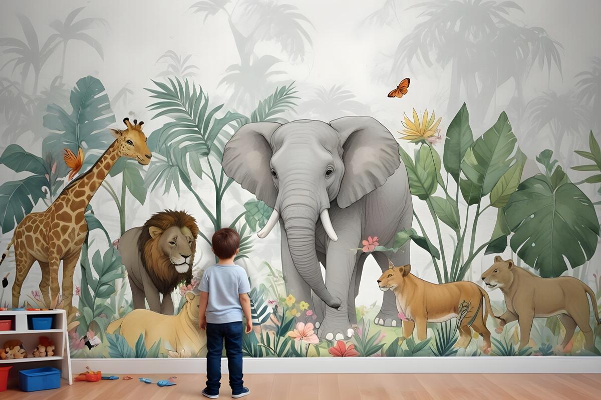 Yeşil Yapraklı Çocuklar Tropikal Safari Hayvanları Çocuk Odası Duvar Kağıdı