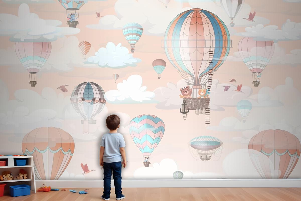 Yumuşak Pembe Sıcak Hava Balonları Bebek Odası Duvar Kağıdı