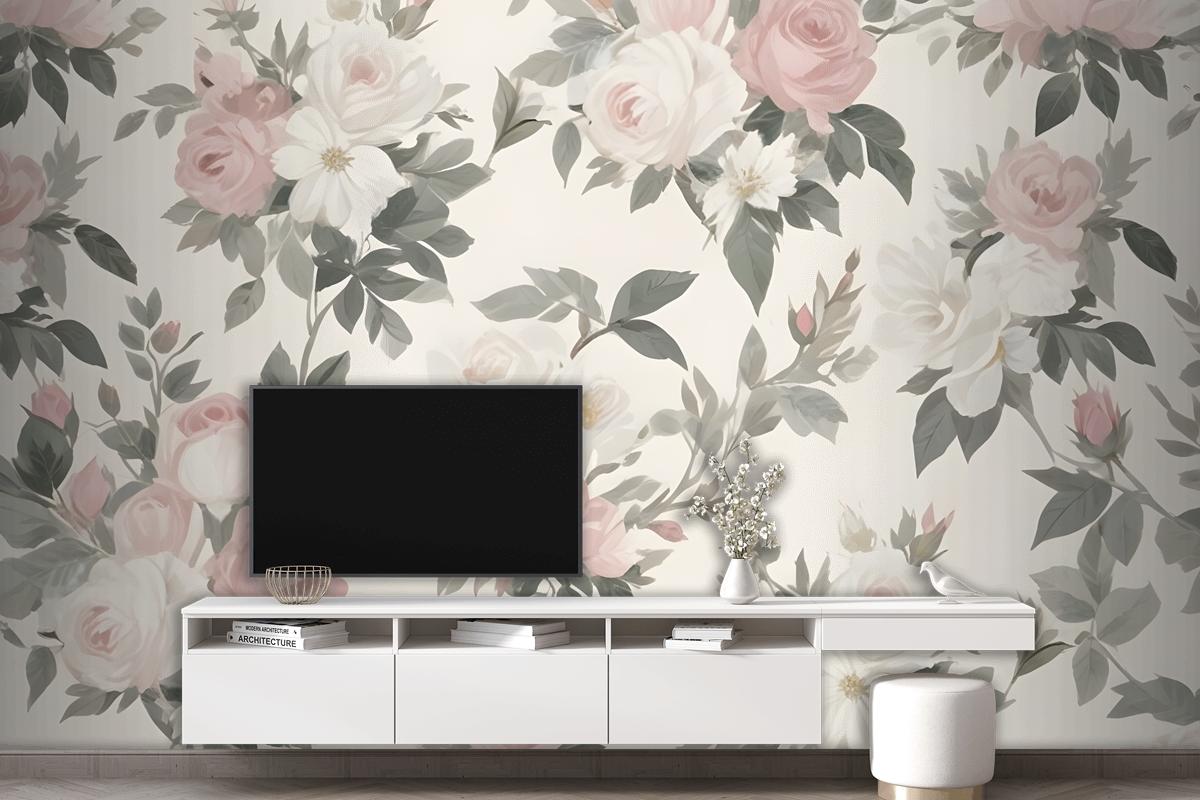 Yumuşak Sessiz Çiçek Desenli Büyük Pembe Beyaz Çiçekler Gül Yeşil Yaprakları Oturma Odası Salon Duvar Kağıdı